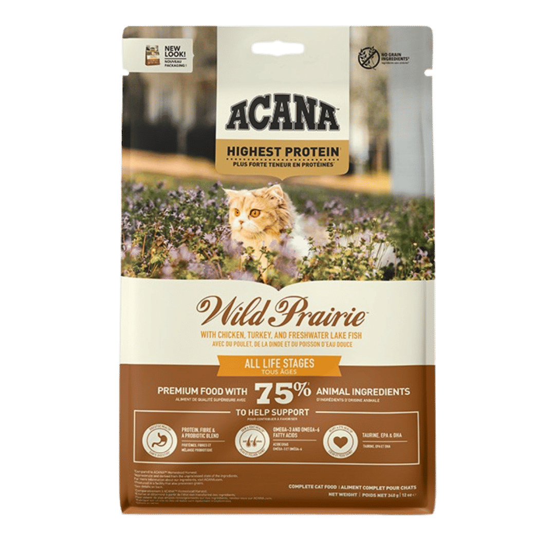 Acana Highest Protein Wild Prairie brings the rich flavours of free-run chicken, turkey, and nutrient-packed chicken liver to your cat’s bowl. Crafted with 75% quality animal ingredients, it’s a protein-rich recipe made to nourish your cat and help them thrive. Tailored to promote healthy digestion and support skin, coat, heart and eye health, Wild Prairie is a delicious way to give your cat the nutrition they need to stay active and healthy every day.