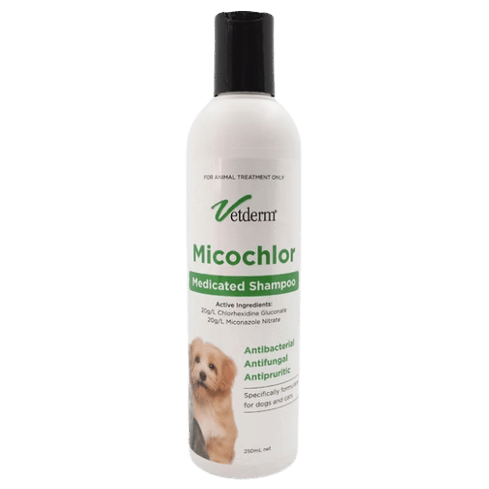 Micochlor Shampoo is for the treatment of minor skin conditions responsive to miconazole and/or chlorhexidine in dogs and cats. Micochlor also provides relief from minor itchy skin and cleans and conditions coats.