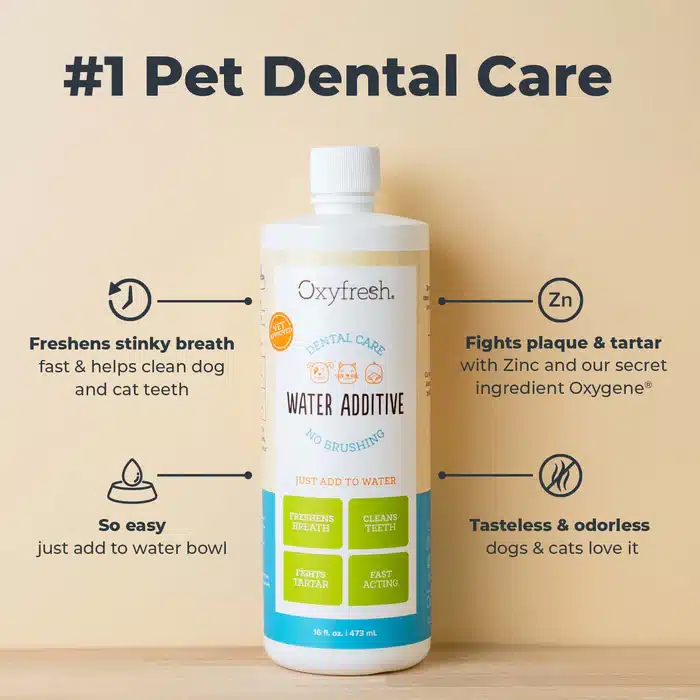- IT WORKS – Trusted by pet parents and veterinarians to stop bad pet breath, and just like all Oxyfresh products, Pet Dental Water Additive for fresher breath and healthier pet teeth and gums is made in the USA. with only the highest quality, safe ingredients.