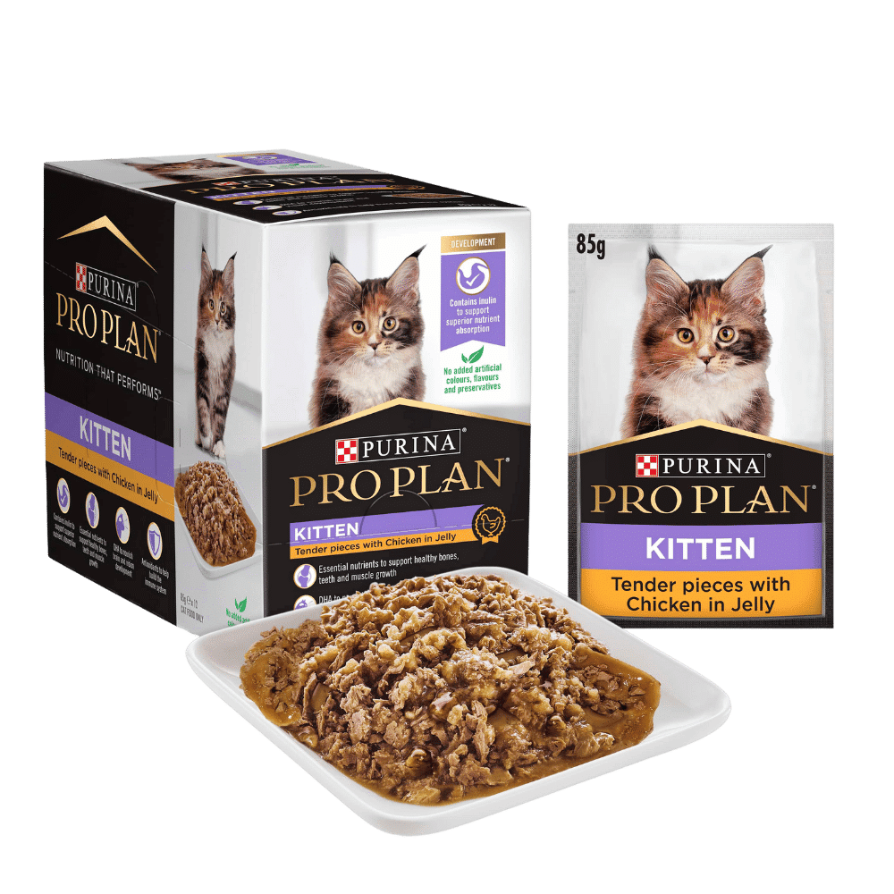 Purina Pro Plan Kitten Chicken in Jelly Wet Cat Food is scientifically formulated to be 100% complete and balanced, containing all of the essential nutrients to support your kittens healthy bones, teeth and muscle growth to give your kitten the best start at life. It is made with real Chicken in a tasty Jelly for a delicious flavour your Kitten will love.
