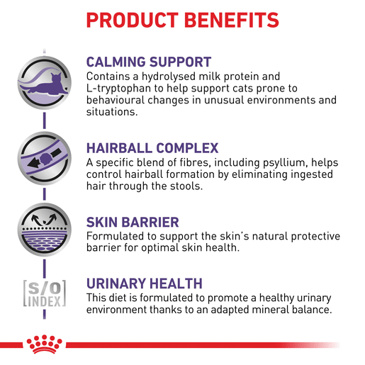 Contains a hydrolysed milk protein and L-tryptophan to help manage cats prone to behavioural changes in unusual environments and situations. - Hairball complex