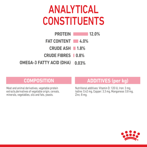 Giving your kitten the best start in life all begins with the right nutrition. Providing it with the essential nutrients it needs will properly support your kitten’s development and growth. Royal Canin Kitten Loaf is specially formulated to support the nutritional needs of kittens in the “consolidation phase” of their growth. This formula is suitable for 4 to 12-month-old kittens as they undergo a period of significant physical and behavioural changes. Its formulated with an adapted texture and aroma for growing kittens, and helps support the development of the kitten’s healthy immune system with the inclusion of nutrients such as Vitamins E and C.