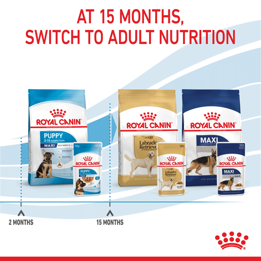 It is also enriched with omega-3 fatty acids, including DHA, which have been scientifically proven to support healthy brain development in puppies. Once puppies reach 15 months of age, they can be transitioned onto a Maxi Adult diet, available as either dry kibble or wet food in gravy.