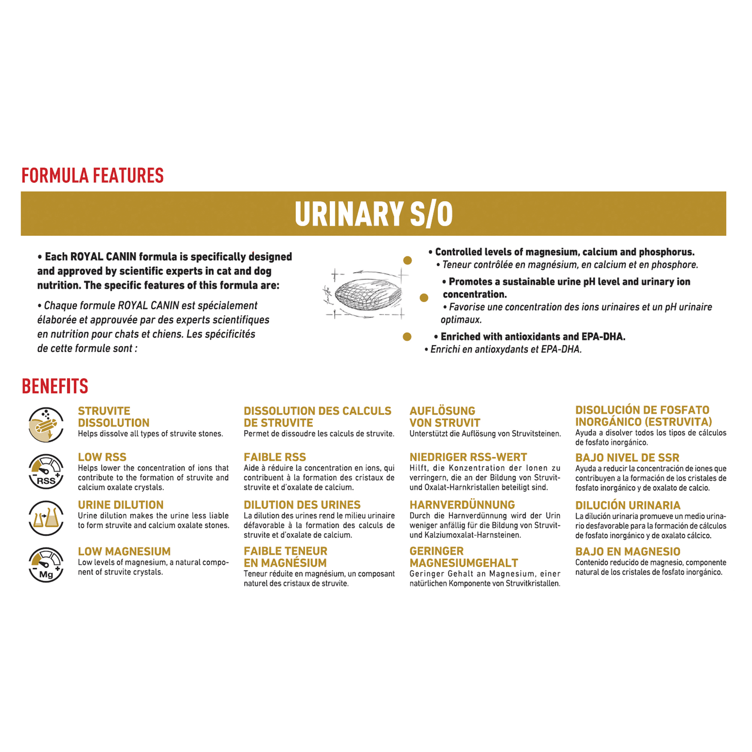 - Low Relative Supersaturation (RSS): Reduces urinary ion concentration to lower the risk of struvite and calcium oxalate crystal formation.